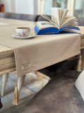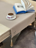رانر دولایه ساده منگوله دار یک رانر شیک و باکیفیت مناسب فضاهای کلاسیک و نئوکلاسیک این رانر با این رنگ کرم جذاب و مدل ساده به میز شما جلوه ای بسیار زیبا می دهد و رنگ خنثی این رانر با اکثر رنگها به راحتی ترکیب میشود ، قابل شستشو با ماشین یا دست می باشد جنس لایه ی زیری مخمل مات ترک با رنگ قهوه ای روشن یا (کرم طلایی) و لایه ی بالایی تور شاین کرم ترک و رنگ منگوله ها کرم طلایی می باشد